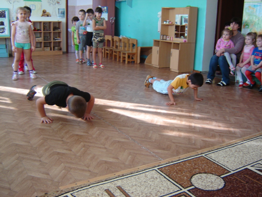 Дети участвовали в конкурсе «Подъём», делали зарядку (отжимание). Командиры вели своих бойцов по маршруту. Дети показывали зрителям, какие они меткие стрелки. В конкурсе «Переправа» участие принимали и папы. Детям нужно было перейти через «болото», а папам переправить их обратно. В конкурсе «Важный пакет» дети искали пакет, в котором находились конфеты.