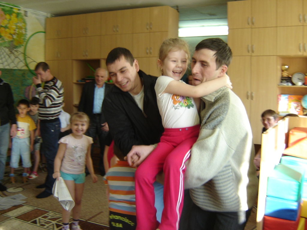 В начале праздника дети поздравляли пап, рассказывали им стихи, пели песни, танцевали. Дети показывали парад разных родов войск: шагали маршем, скакали на лошадках, как кавалеристы, плавали по морю на кораблях, вели большие самолёты. Всё это происходило под музыкальные фрагменты.