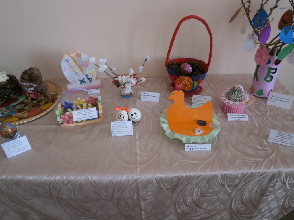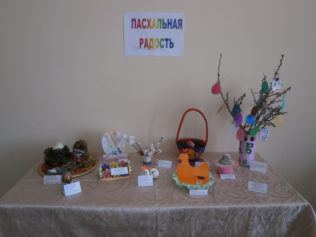 С 1 по 9 классы учащиеся нашей школы приняли участие в конкурсе – фестивале декоративно-прикладного творчества «Пасхальная радость». Данный конкурс проходил 7 по 15 апреля 2014 года. В этот период учащиеся ученики делали творческие работы, отражающие символ Пасха, выполненные в различных техниках декоративно-прикладного творчества, и в завершении была представлена выставка под названием «Пасхальная радость».