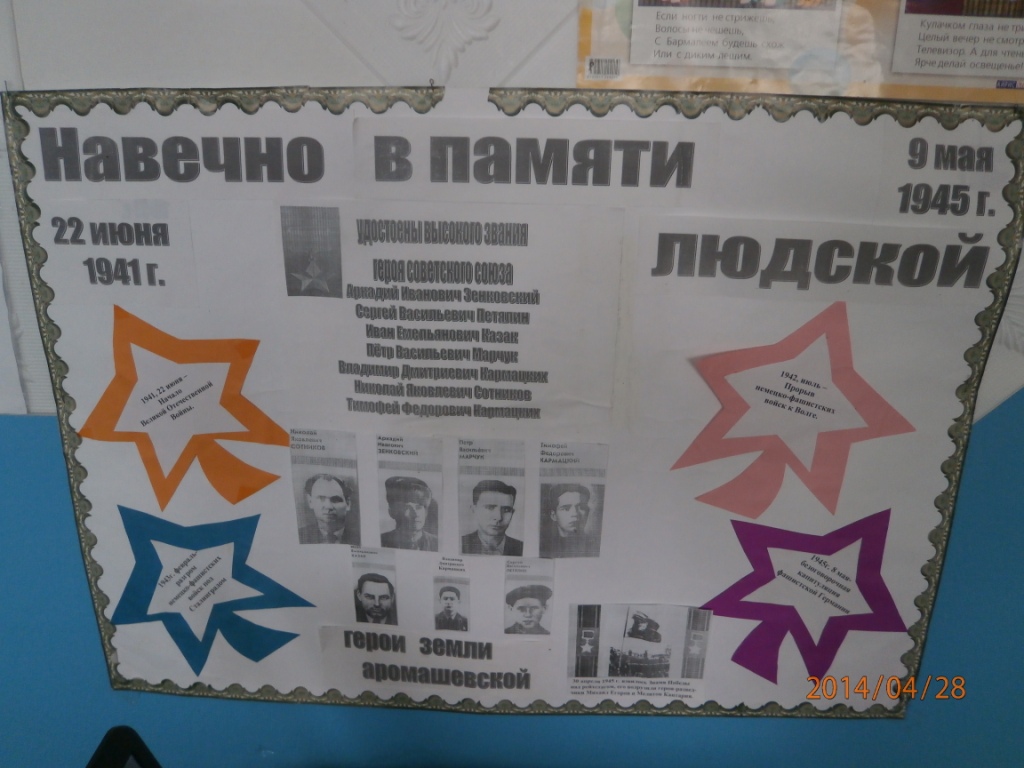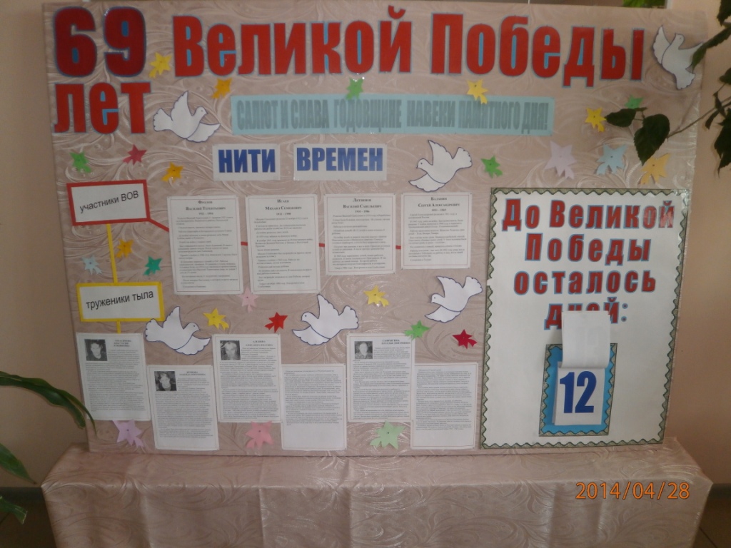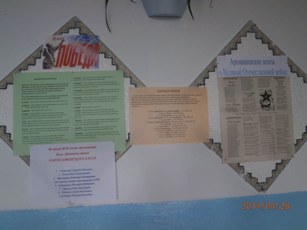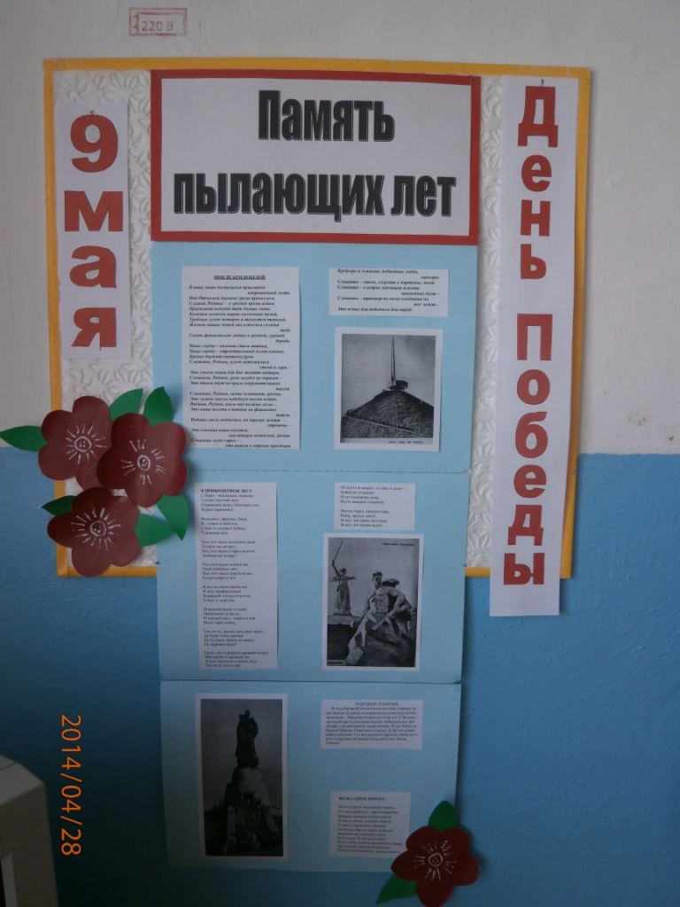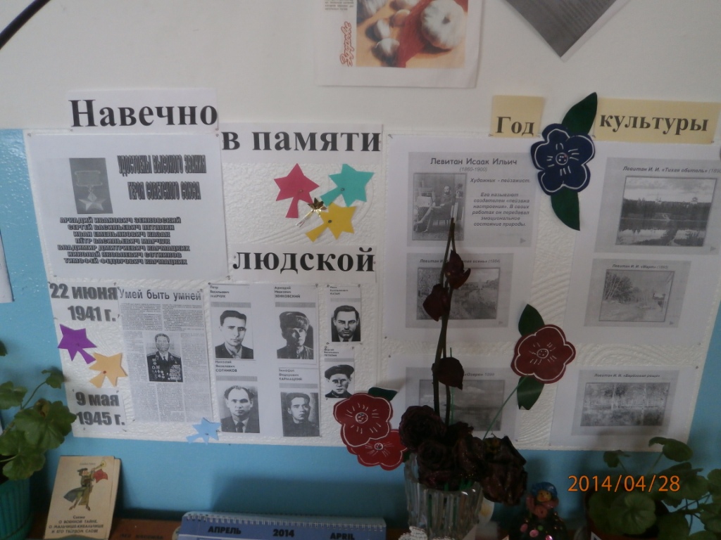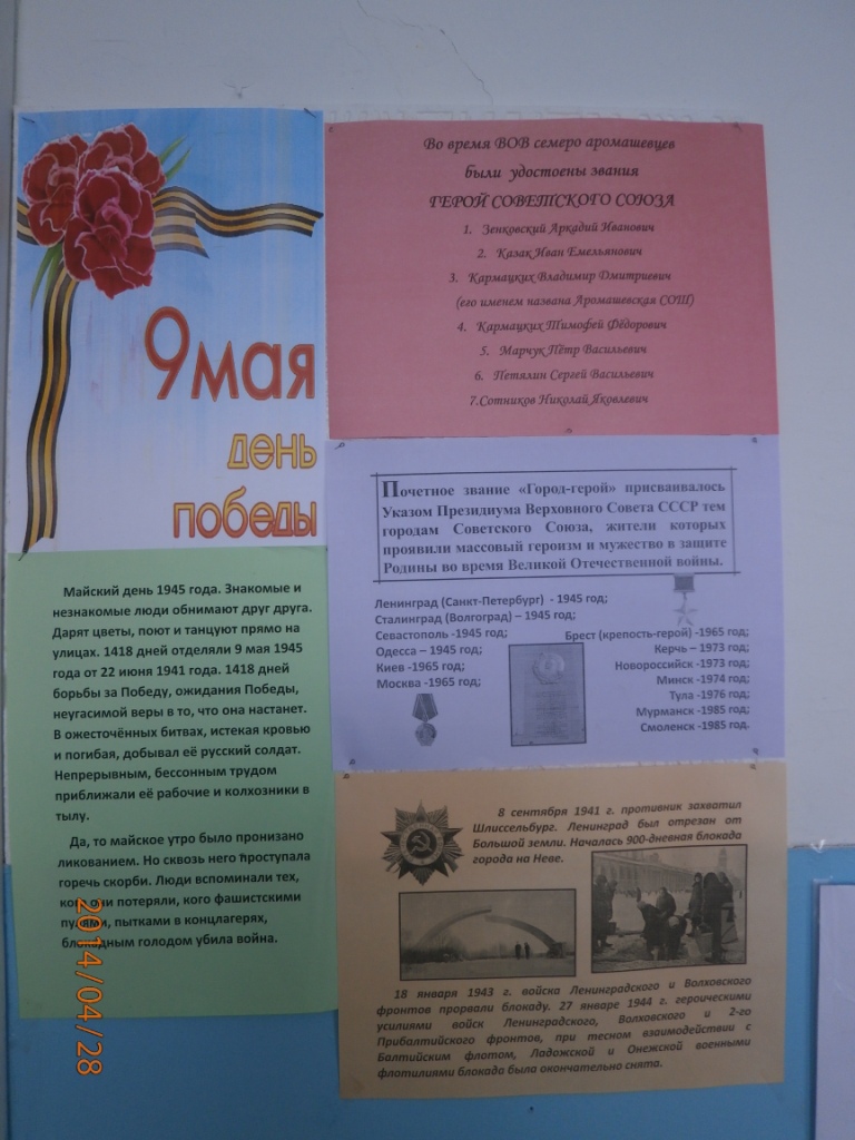 В «Слободчиковской ООШ» прошла подготовка к празднованию 69-ой годовщины Победы. На первом этаже была сделана выставка «69 лет Великой победы», так же в каждом классе были обновлены классные уголки.