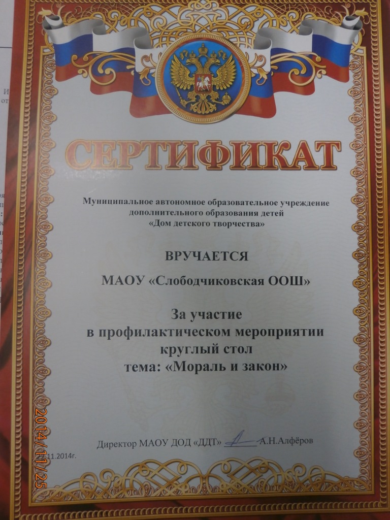 22 ноября 2014 года на территории МАОУ ДОД «Дом детского творчества» состоялся круглый стол на тему: «Мораль и закон», где учащиеся нашей школы приняли участие, а именно Лохнова Саша, Леонтьева Лена. Анкушева Лиза, Сысунина Маша и Одинцова Даша. В завершении все учащиеся были награждены сертификатом.