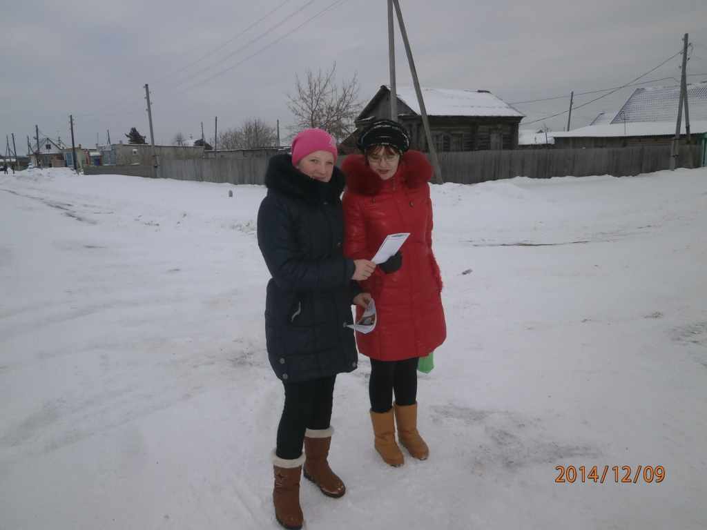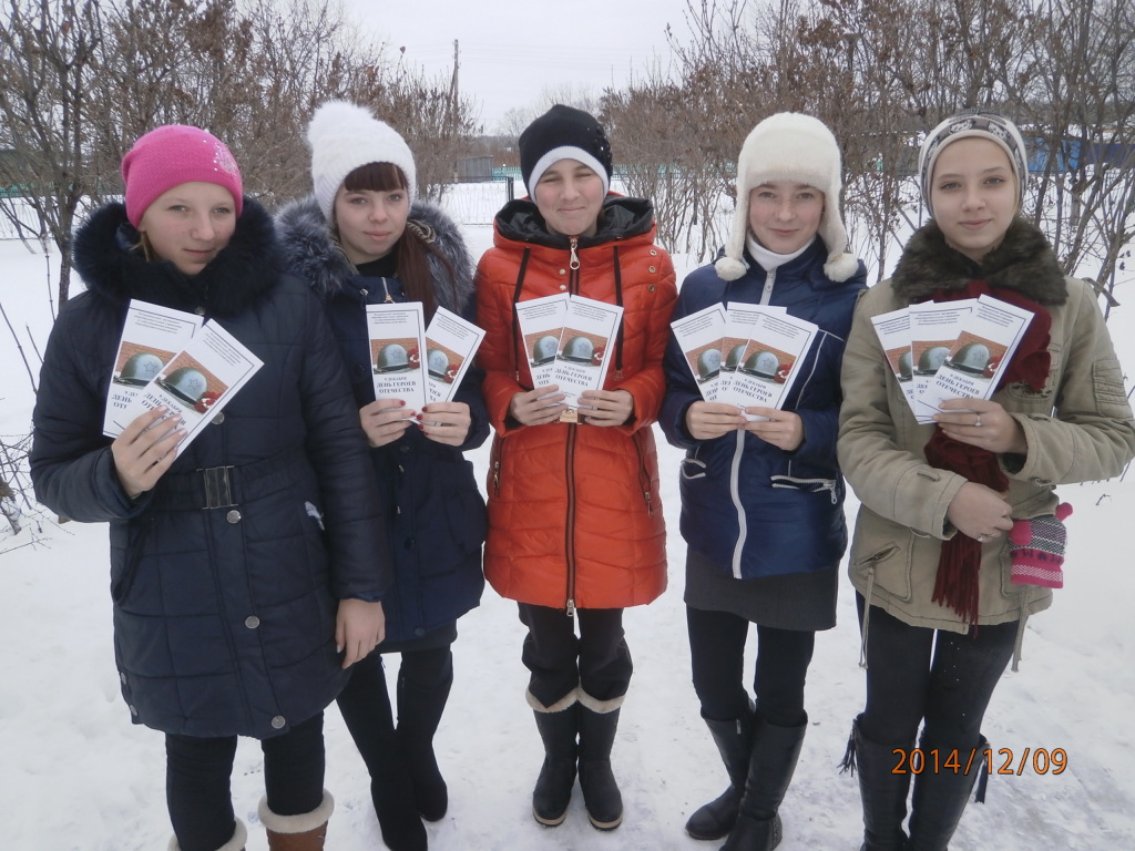 9 декабря 2014 года в нашей школе прошла акция по распространению в общественных местах листовок с информацией об истории учреждения Дня Героев Отечества, о земляках – Героях Советского Союза и Героях России. Учащиеся 6-8 классов с классным руководителем Усановой С. А. раздавали буклеты на улицах нашего села.