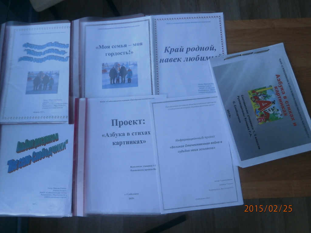 В конкурсе приняло участие 5 проектов. Учащимися школы были представлены проекты: «Азбука в стихах и картинках» (групповой проект 1-2 класса, защищал Волков Никита, руководитель – Кочнева Г.А.), «Моя семья – моя гордость!» (Ширшова Ксения 4 класс, руководитель- Ибрагимова Р.Ж.), «Край родной, навек любимый» (Иванова Ксения 4 класс, руководитель – Ибрагимова Р.Ж.), «Экскурсия в профессию» (Колбина Олеся 8 класс, руководитель – Усанова С.а.), «Великая Отечественная война в судьбах моих земляков» (Гудаева Мария 6 класс, руководитель – Беспалова М.П.).