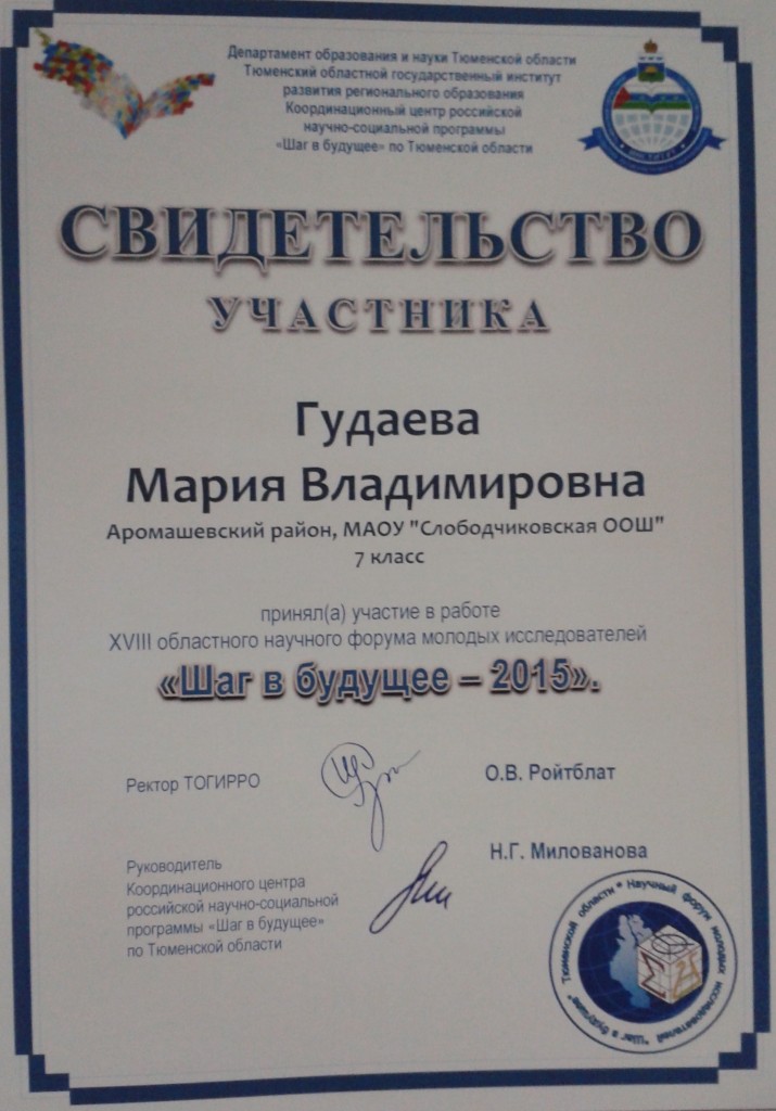 24 октября 2015 г. Гудаева Мария, ученица 7 класса, приняла участие в очном этапе XVIII областного научного форума молодых исследователей «Шаг в будущее», который состоялся в гимназии № 1 г. Тюмени.