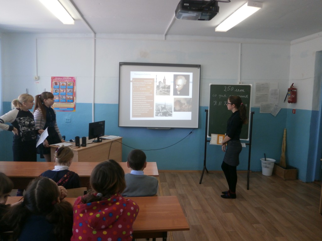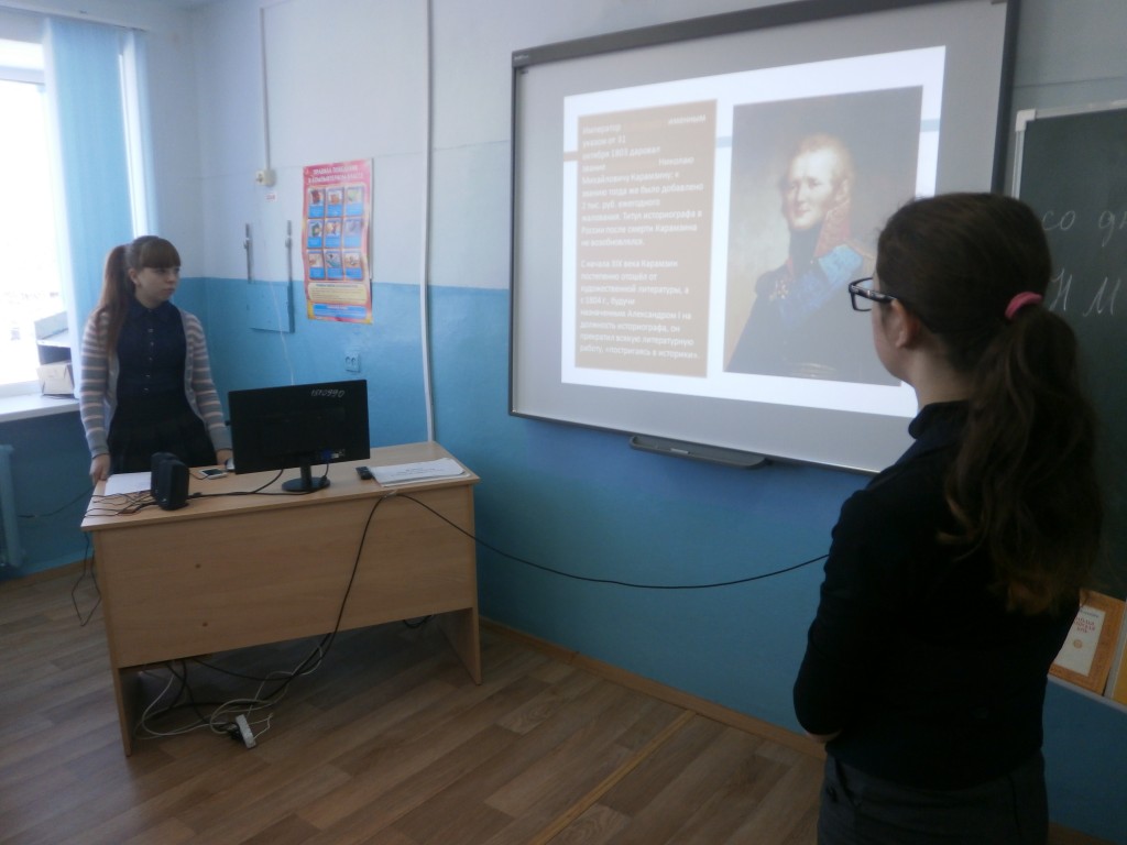 16 ноября в рамках проведения тематических уроков учащимися 9 класса проведен литературный час — электронная презентация «Он спас Россию от нашествия забвения…» (Историк и писатель Н.М. Карамзин: штрихи к портрету). Учащиеся рассказали ученикам 5-9 классов о том, что Николаю Михайловичу Карамзину в 2015-2016 учебном году исполняется 250 лет со дня рождения. Крупнейший русский литератор, великий реформатор русского языка и выдающийся историк. Создатель одного из первых глобальных трудов по истории России — «Истории государства Российского». В целом на развитие русского литературного языка проза и поэзия Карамзина оказали огромнейшее влияние. Именно его трудам литература обязана переходом от церковнославянской лексики и грамматики к обиходному языку. Также учащиеся 9 класса познакомили присутствующих с поэзией Карамзина.