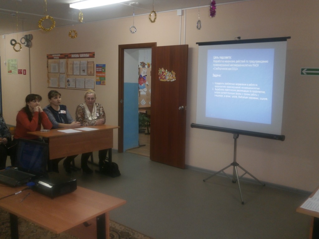 21 декабря в МАОУ «Слободчиковская ООШ» состоялся расширенный педсовет по теме «Профилактика преступлений и правонарушений». В педсовете приняли участие 18 человек: педагоги школы, работники Дома Культуры, зам.главы сельского поселения, специалист по социальной работе КЦСОН, председатель совета ветеранов, руководитель музея сельского поселения, главный специалист сектора опеки и попечительства районной администрации, начальник районного отдела образования. В роли «учителей», «детей», «общественности» и «родителей» во время деловой игры побывали все присутствующие, где более подробно был рассмотрен вопрос «Детская агрессия-одна из причин правонарушений и преступлений». Участники педсовета вели откровенный разговор о причинах правонарушений, о тех упущениях, которые допускают учителя, родители и общественность в вопросах воспитания детей, какие меры нужно предпринимать, чтобы предотвратить преступления и правонарушения среди несовершеннолетних. По окончании заседания были намечены конкретные меры, приняты решения.