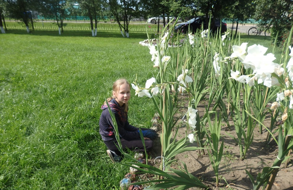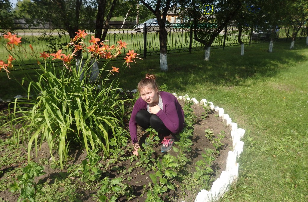 Сегодня в теплый летний день ребята из экологического отряда «Зеленый патруль» с руководителем Селиной Татьяной Николаевной пропололи клумбы различных цветов. Клумбы стали чистыми от сорняков. На душе стало хорошо. Все были довольны.