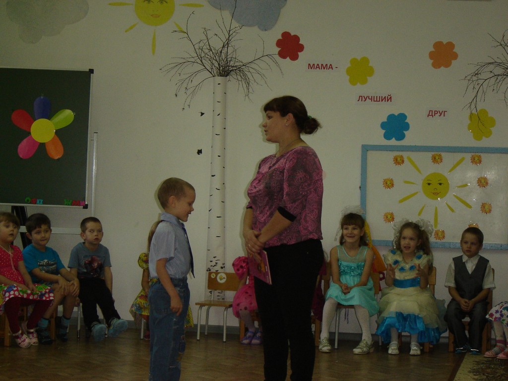 25 ноября в старшей разновозрастной группе «Солнышко» в конце тематической недели «День матери» прошёл утренник «Мама – лучший друг». Дети читали стихи, пели песни о мамах. Девочки старшей группы показали сценку «Три мамы», где рассказали о том, как нелегко быть мамами. С мамами проводились различные игры. Они разгадывали загадки, старались узнать своих детей по голосу. Эмоционально прошло выступление мамы и сына «Скоро в школу», где они рассказали о жизни в детском саду и школе. Для своих мам девочки исполнили красивый танец. Дети поздравили всех мам с праздником и подарили им открытки со цветами, которые сделали сами.