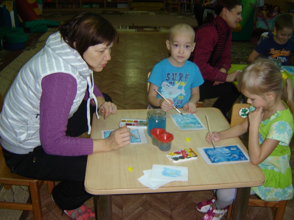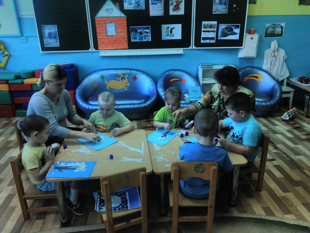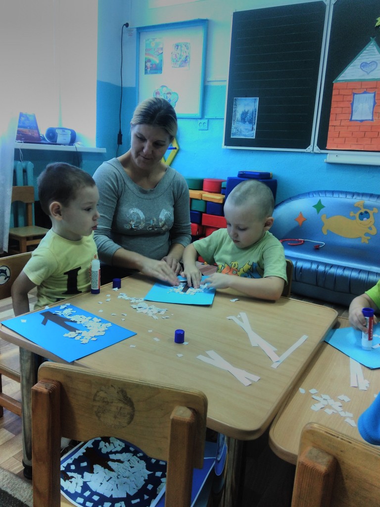 Малыши занимались аппликацией «Зимнее дерево». Способом «обрыва» дети покрывали дерево снегом.